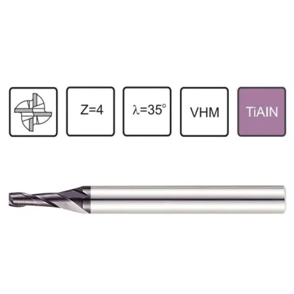 This is a carbide 1 VHM solid carbide face milling cutter, TiAIN coated, with a smooth DIN6535 HA cylindrical shank. The cutter is made of fine-grained VHM carbide, designed for professional machining of hard materials. It is suitable for cutting alloy steel, stainless steel, heat-resistant steel, cast iron, cast steel and other hard-to-machine materials. It is designed for line machining, profiling, copying, making grooves and channels. VHM carbide fi 1 cutters are characterized by increased impact strength and wear resistance even at elevated temperatures. The use of an innovative coating also has the advantage of high resistance to oxidation, increased chemical resistance, low coefficient of friction and good adhesion to the substrate. The fi 1 carbide burrs we offer are recommended for various types of machine tools, including both conventional and modern machine tools with low radial runout.