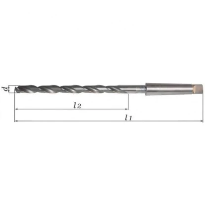 Hochwertiger Langbohrer für Metall fi 52 spindelförmig Typ NWKy nach DIN 341. Es ist ein Langbohrer mit einer Gesamtlänge von 740 mm und einer Arbeitsteillänge von 500 mm. Er hat einen Nenndurchmesser von 52 mm und einen Morsekegel-Schaft. Langbohrer für Metall fi 52 NWKy eignen sich zum Bohren von sehr tiefen Löchern in harte und schwer zu bearbeitende Werkstoffe der Klasse P1.2 - P1.3.. Das sind unlegierte Stähle, Baustähle, Automatenstähle, Metalle, Buntmetalle, Metalllegierungen, Grauguss, Bronze, Messing, duroplastische Kunststoffe. Die Bohrer werden aus dem modernen Schnellarbeitsstahl HSS (High SPeed Steel) hergestellt. Dies ist ein Stahl mit außergewöhnlichen Eigenschaften und hoher Festigkeit. Er hat außerdem den Vorteil einer überdurchschnittlichen Verschleißfestigkeit, Zähigkeit und Schlagzähigkeit. HSS-Bohrer sind sehr hart und langlebig und widerstandsfähig gegen jegliche mechanische Beschädigung. Sie eignen sich zum Bohren von Löchern in Werkstücken aus harten und schwer zerspanbaren Werkstoffen der Klasse P1.2 - P1.3.