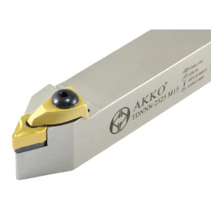 HochwertigesKlapp-Drehmesser TDNNN 32x32-15 - Wendeplatten-Spannsystem: T. Entwickelt für die professionelle Bearbeitung von harten und schwer zerspanbaren Werkstoffen, einschließlich unlegierter und legierter Stähle, Stahlguss, Gusseisen, Edelstahl, Metalle und Nichteisenlegierungen. Drehwerkzeuge in unserem Shop hat einen auf 40 - 45 HRC gehärteten Schaft. Die von uns angebotenen Drehmesser TDNN 32x32-15 sind auch für die anspruchsvollsten Kunden geeignet. Sie gewährleisten eine hohe Schnittqualität und gleichzeitig einen hohen Arbeitskomfort. Sie eignen sich zum Schruppen und Schlichten von verschiedenen Oberflächen und Bohrungen. Unsere Drehmesser sind ideal für die Hochleistungsbearbeitung bei erhöhten Geschwindigkeiten. Die Möglichkeit, den Schneideinsatz zu wechseln, senkt die Bearbeitungskosten und erhöht den Komfort beim Schneiden. In unserem Shop bieten wir Ihnen AKKO-Messer
