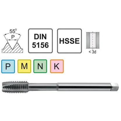 Gewindebohrer G 1 DIN 5156 C HSSE Narex ist ein Hochleistungsgewindefräser zum Schneiden von zylindrischen G1-Zoll-Rohrgewinden in Durchgangsbohrungen. Hergestellt aus haltbarem HSSE-Schnellstahl mit Kobaltzusatz, bietet er eine lange Lebensdauer, Verschleißfestigkeit und effiziente Bearbeitung von Stahl, Edelstahl und Gusseisen.