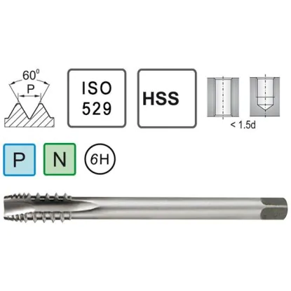 Moderner gewindebohrer nach der Maßnorm ISO 529, Schaftdurchmesser B. Die Gewindeschneidmaschine ist für das Schneiden von gewöhnlichen metrischen Gewinden, Typ M, mit einem Querschnitt von 12 mm bestimmt. Diese metrischen Maschinengewindebohrer sind für verschiedene Arten von konventionellen und numerischen Werkzeugmaschinen geeignet. Sie sind vollständig aus hochlegiertem Kobalt-Schnellstahl HSSE gefertigt. Dies ist ein Stahl mit außergewöhnlichen technischen Eigenschaften. Er zeichnet sich durch seine hohe Festigkeit aus, die es ihm ermöglicht, auch unter schwierigen Bedingungen zu schneiden, sowie durch seine hohe Widerstandsfähigkeit gegen abrasiven Verschleiß und gegen mögliche mechanische Beschädigungen der Schneiden. Die Gewindebohrer eignen sich für das professionelle Schneiden von Werkstücken aus hartlegierten Stählen, Edelstahl, säurebeständigem Stahl, hitzebeständigem Stahl, hitzebeständigem Stahl, Stahlguss und Gusseisen.