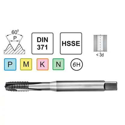 Hochwertiges gewindebohrer M5 Durchgangsloch DIN 371 mit verstärktem Schaft für die professionelle Bearbeitung auf herkömmlichen Werkzeugmaschinen. Geeignet zum Gewindeschneiden von Durchgangslöchern verschiedener Längen in Materialien, die kurze Späne erzeugen (B-Schnitt). Geeignet zur Herstellung von metrischen Regelgewinden, Typ M, 5 mm Durchmesser, 60 Grad, ISO DIN-13, nach DIN 371, Toleranzfeld ISO2(6H). Er zeichnet sich durch eine hohe Schneidkapazität aus, wodurch die Schneidzeit und die Arbeitsintensität erheblich reduziert werden. Der Gewindeschneider wird aus einem speziellen Kobalt-HSSE-Schnellarbeitsstahl hergestellt, dessen Eigenschaften den Katalog der zu bearbeitenden Werkstoffe erheblich erweitern. Dazu gehören sehr harte und schwer zu bearbeitende Rohstoffe wie rostfreier Stahl, hitzebeständiger Stahl, säurebeständiger Stahl, Stahlguss, Grau- und Zieheisen, Sintermetall und Hartmetalllegierungen. Die Gewindeschneidmaschine ermöglicht außerdem ein hochpräzises Schneiden und ist gleichzeitig resistent gegen raue Arbeitsbedingungen. Die Klinge wird beim Schneiden kaum mechanisch beschädigt.