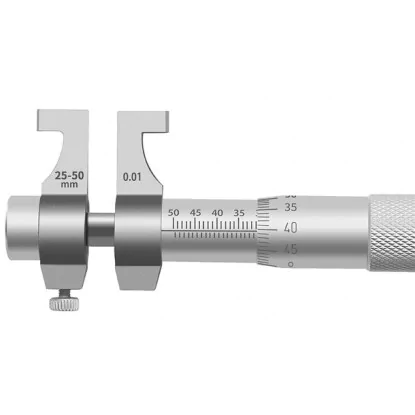 EineInnenmessschraube mit 25-50 Backen für Innenmessungen. Sie hat geschliffene Messflächen aus Hartmetall. Die Messung kann dank der Feststellschraube angehalten werden.
