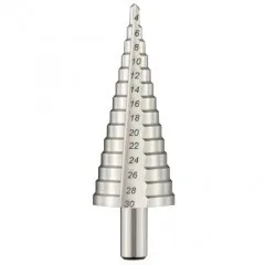 Die konischen Bohrer für Metall haben eine Härte von 64 HRC und eine Zugfestigkeit von RM= 800 MPa. Der konische Bohrer ist außerdem widerstandsfähiger gegen Abrieb und jegliche Beschädigung und ist definitiv widerstandsfähiger gegen hohe Temperaturen. Er ist mit zwei Schneiden ausgestattet, die eine hohe Präzision und Zentrierung des Bohrlochs gewährleisten. Es ist kein Vorbohren erforderlich. Dank seiner konischen Form lässt er sich problemlos aus einem bereits gebohrten Loch entfernen und ist daher ideal für die Bearbeitung von Blechen, auch von dünnwandigen Blechen. Diese Stufenbohrer eignen sich für die Bearbeitung von Materialien wie Kohlenstoff- und Legierungsblechen sowie von unabhängigen Metallen, Kunststoffen und Duroplasten bis zu einer Dicke von 4 mm. Mit einem Stufenbohrer ist es möglich, gleichzeitig zu bohren, zu zentrieren, zu reiben und zu entgraten.
