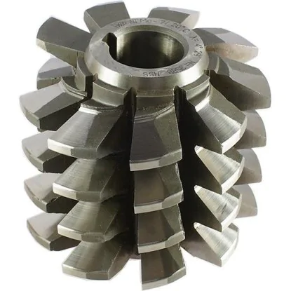 Der Schneckenfräser wird für die Serien- und Massenbearbeitung von Zahnrädern nach dem Hüllverfahren eingesetzt. Die Schneiden dieses Fräsers werden durch das Schneiden von Schneckenrädern mit Spanleitstufen gebildet, die zu ihrer Achse in einem Winkel geneigt sind, der dem Schrägungswinkel der Windungen entspricht, gemessen auf einem Teilungszylinder mit dem Durchmesser Dp. Nachdem die Spanleitstufen in einem Winkel von 25 Grad gefräst wurden, werden die Schneiden in radialer Richtung versetzt.