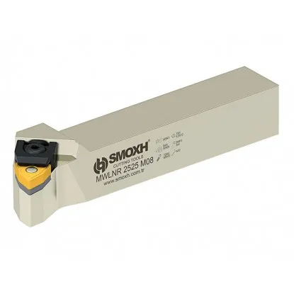 Nóż tokarski składany MWLNR 20X20 -K08 Smoxh na płytkę wieloostrzową WNM. 0804rr. SYSTEM „M" - ujemna geometria noży. Płytki wymienne dwustronne (kąt przyłożenia płytki równy 0°) mocowane są kołkiem na powierzchni otworu cylindrycznego i dociskiem z góry na powierzchni natarcia.