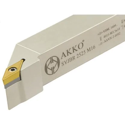 Nóż tokarski składany SVJBR 16x16-16 Tureckiej firmy Akko na płytkę wieloostrzową VBMT 160408. System mocowania płytek - „S" . Większość noży do toczenia zewnętrznego, dodatnia lub ujemna noże wytaczaki geometria noży. Płytki wymienne jednostronne mocowane na powierzchni otworu stożkowo-łukowego za pomocą śruby z łbem stożkowym.