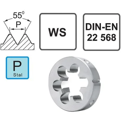 Schneideisen 1-8 BSW Whitwortha Zoll zum Schneiden von Außengewinden. NHWa Lochstempel, 55-Grad-Winkel, 1,75 Mutter. Zollgewinde werden in Rohrverbindungen, Installationen und Armaturen verwendet. Unsere Schneidbacken werden vollständig aus speziellem Werkzeugstahl mit der Bezeichnung WS hergestellt. Dies ist ein Stahl mit außergewöhnlichen mechanischen Eigenschaften. Zunächst einmal sind Werkzeuge aus diesem Stahl außergewöhnlich haltbar und hart. Sie zeichnen sich durch eine erhöhte Widerstandsfähigkeit gegenüber rauen Arbeitsbedingungen aus und ermöglichen eine höhere Bearbeitungsgeschwindigkeit. Selbst bei der daraus resultierenden Temperatur (bis zu 600 Grad Celsius) unterliegen die Meißel von Whitworth keinen mechanischen Beschädigungen wie Bruch, Absplitterung, Abstumpfung oder Rissbildung. Dies führt nicht nur zu kürzeren Arbeitszeiten, sondern auch zu der Möglichkeit, die Gesamtbearbeitungskosten zu senken. Die vorgeschlagenen Meißel sind für das Gewindeschneiden von Werkstücken aus Materialien der Klasse P1.2 - P1.3. geeignet