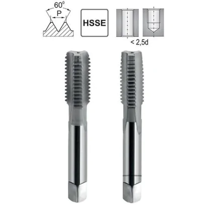 2-piece configuration: ripper with a long nut and finisher with a short nut; straight chip grooves facilitate back-to-turn cycles; square shank to knob; HSS high-speed steel; manufacturing tolerance 6H, pair with 6g; 60-degree profile according to ISO 68-1; dimensions and pitches according to ISO 261/262; internal tolerances according to ISO 965; hand set design according to DIN 352; recommended 1.2mm drill bit for full outline as a set of M1.4x0.2 hand taps.