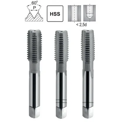 M14x1.25 ISO 529/3 6H HSSHand Taps are used for making M14 metric fine threads with a pitch of one and one-quarter millimeters in structural steels and metal alloys with strengths up to eight hundred mega pascals. A three-member system - ripper, intermediate, finisher - distributes torsional torque, ensuring smooth machining and maintaining a six H fit class.