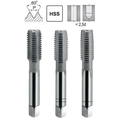 Hand tapsM4,5 x0,75 HSS - a set of three professional hand taps, which includes: pre-threader - 8P, ripper - 4P and finisher - 2P. They are designed for making metric ordinary threads type M, diameter 4,5 mm. The threading process is carried out manually in three successive stages, and the total allowance of the cut material is divided among all three threaders respectively. A special knob is required for threading. The tools are in accordance with DIN 352, ISO DIN-13. M4,5 hand taps are produced from special tool steel HSS (High Speed Steel), the properties of which allow professional processing of unalloyed steels, metals, non-ferrous metals, plastics, metal alloys. The advantages of HSS are noticeable in the possibility of obtaining high machining efficiency and high cutting precision. The tolerance class of the threads made is ISO2-6H. In addition, threaders are resistant to harsh working conditions and their blades are resistant to any mechanical damage. This extends the time of use of threaders, and also affects the reduction of labor costs. The offered threaders are manufactured by the Serbian company FRA. This is a brand valued by specialists all over the world. Taps of the FRA brand are characterized by higher cutting parameters.
