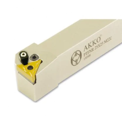 Double-sided interchangeable inserts (the angle of application of the insert equals 0 degrees), triangular, square and rhombic, are fixed on the surface of the cylindrical bore with a pin, a clamping wedge and a screw. PTFNR 20x20 folding lathe knives with inserts fixed in the "P" system are used for roughing. The "P" system is characterized by easy insert change, no loose clamping elements.