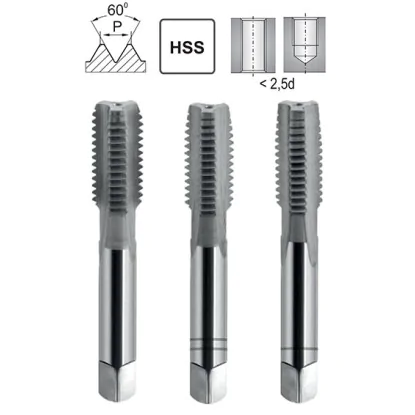 Hand taps M18 left x2,5 HSS. High-quality set of professional general-purpose taps from the well-known Serbian brand FRA. They are designed for cutting ordinary metric threads, type M diameter 18, left-hand (LH), with an angle of 60 degrees, through and blind, ISO DIN-13. They are suitable for machining materials marked with the symbol P1.2 - P1.3. These include unalloyed steels (carbon), metals, non-ferrous metals (copper, aluminum), metal alloys (brass, bronze) and also hard plastics. The biggest advantage of taps is that they are made of modern HSS - High Speed Steel. This is a unique material that results in increased machining efficiency and increased precision of cut threads. In addition, HSS steel also increases the resistance of the thread taps' blade to possible damage occurring during the machining of hard and difficult-to-machine materials. M18 left hand taps are in accordance with DIN 352, and the tolerance field is ISO 2(6H).