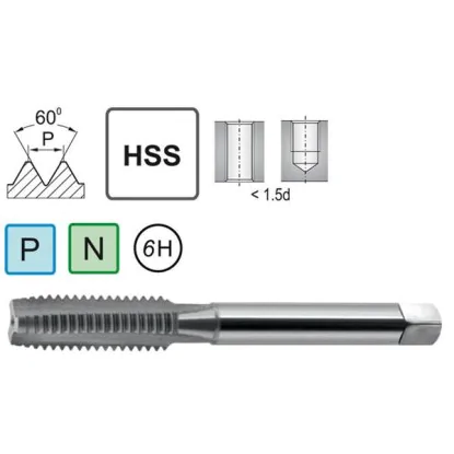Machine taps for metric fine threads, type M10x0.75. Manufactured in accordance with DIN 374, from modern HSS. It has a nut A - for through-holes and blind holes. The M10x0,75 machine tapping offered by us is suitable for machining hard and hard-to-machine materials of P1.2 - P1.3. class These are unalloyed steels, automatic steels, metals, non-ferrous metals, metal alloys, plastics. The tapping machine is distinguished by its increased resistance to difficult cutting conditions. Even under the influence of high temperatures reaching up to 600 degrees, the blades of the tapping machine maintain high hardness and resistance to any mechanical damage.M10x0.75 machine threader for steel is suitable not only for amateur machining, but primarily for industrial applications. It is dedicated to both individual customers and large manufacturing plants.