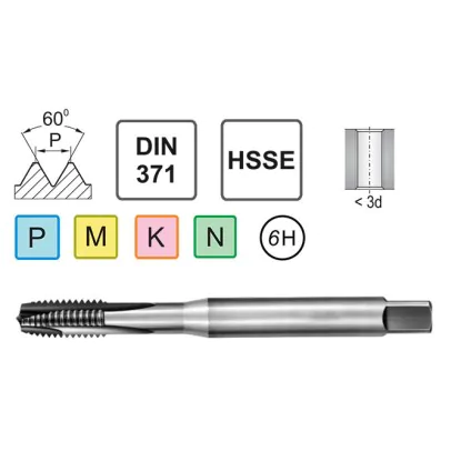 Professional M3 straight through machine tapping threader - for general purpose through holes with reinforced shank for machine cutting of M3 mm metric ordinary threads, with an angle of 60 degrees, ISO DIN-13. type B threader nut - for threading various lengths of through holes in materials giving short chips. It is made in accordance with DIN 371 from special cobalt HSSE tool steel. This is a unique material, allowing a significant expansion of the catalog of available materials for machining.